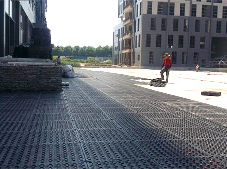 该种板材自身就具有蓄水、排水两种综合功能,板材具有空间刚度高的特点,抗压性明显优于同类产品(可以通过现场试验检验),能够承受400Kpa以上的高抗压负荷,同时可以承受在种植顶板回填土过程中机械碾压的极端负荷情况。结合土工布一起使用,可以避免细颗粒基质堵塞排水通道,保持排水通畅和空气流通,从而形成一个完整的、新型的组合过滤蓄水排水系统,是传统滤水材料的良好替代品。
