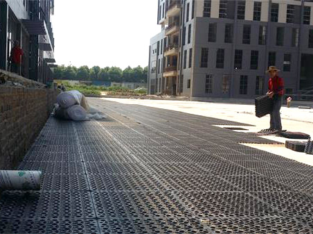 该种板材自身就具有蓄水、排水两种综合功能,板材具有空间刚度高的特点,抗压性明显优于同类产品(可以通过现场试验检验),能够承受400Kpa以上的高抗压负荷,同时可以承受在种植顶板回填土过程中机械碾压的极端负荷情况。结合土工布一起使用,可以避免细颗粒基质堵塞排水通道,保持排水通畅和空气流通,从而形成一个完整的、新型的组合过滤蓄水排水系统,是传统滤水材料的良好替代品。